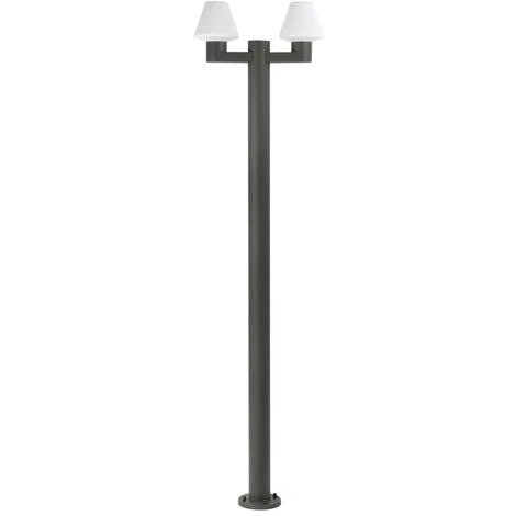 MISTU est un lampadaire de style moderne pour l’éclairage extérieur, en aluminium et polycarbonate opale. C’est la version à deux lumières.