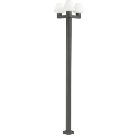 MISTU est un lampadaire de style moderne pour l’éclairage extérieur, en aluminium et polycarbonate opale. C’est la version à trois lumières.
