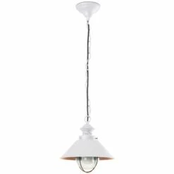 Lampe suspension extérieur blanc et cuivre, modèle NAUTICA de FARO. Fabriqué en acier et verre. Cette lampe est compatible avec une ampoule E27 non inclus. Ce luminaire a un indice de protection IP 33 et un isolement de classe I.