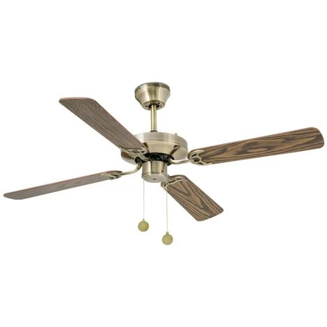 Ventilateur de plafond modèle YAKARTA de la marque FARO sans lumière. Dispose d’un moteur AC con 3 vitesses: 14-23-51 W / 115-150-205 RPM. Actionné à laide dune chaînette. Le corps est en acier couleur vieil or, dispose de 4 lames de pletwood de couleur ROBLE foncé et ROBLE EMBLANQUECIDO et a un diamètre de 1210 mm. Vous avez la possibilité de remplacer la tige pour une tige d’extension de taille différente. Ce ventilateur dispos de la fonction inverse, vous pourrez donc l’utiliser en hiver pour améliorer l’efficacité de votre système de chauffage. Ce ventilateur de plafond n’est pas adapté pour l’extérieur.